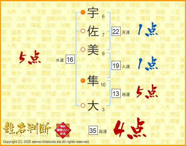 宇(6画)佐(7画)美(9画) 隼(10画)大(3画)