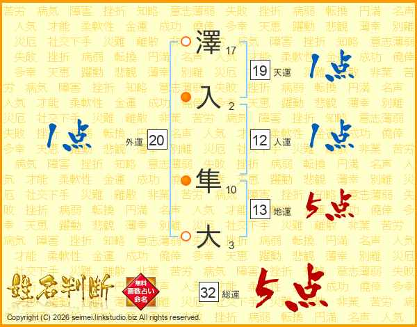 あなたの人生を表す1番重要な運勢です。生涯を通じて影響する総合運となり、主に50歳以降の晩年期に影響を及ぼします。苗字と名前の合計画数。