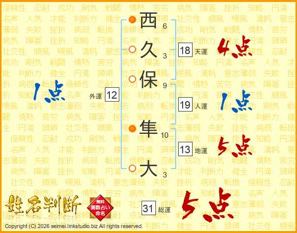 西久保隼大さんの総運は31画の5点!