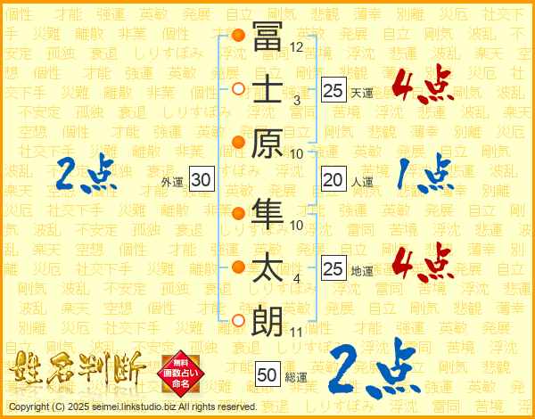 冨(12画)士(3画)原(10画) 隼(10画)太(4画)朗(11画)