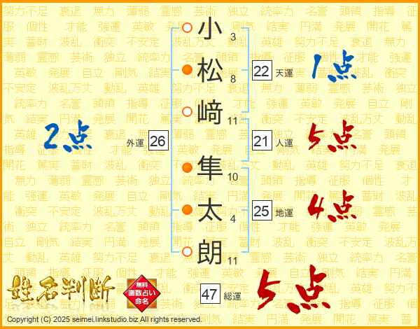 あなたの人生を表す1番重要な運勢です。生涯を通じて影響する総合運となり、主に50歳以降の晩年期に影響を及ぼします。苗字と名前の合計画数。
