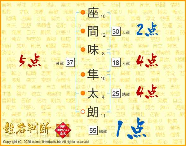 座(10画)間(12画)味(8画) 隼(10画)太(4画)朗(11画)