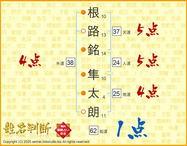 根(10画)路(13画)銘(14画) 隼(10画)太(4画)朗(11画)