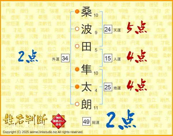 桑(10画)波(9画)田(5画) 隼(10画)太(4画)朗(11画)