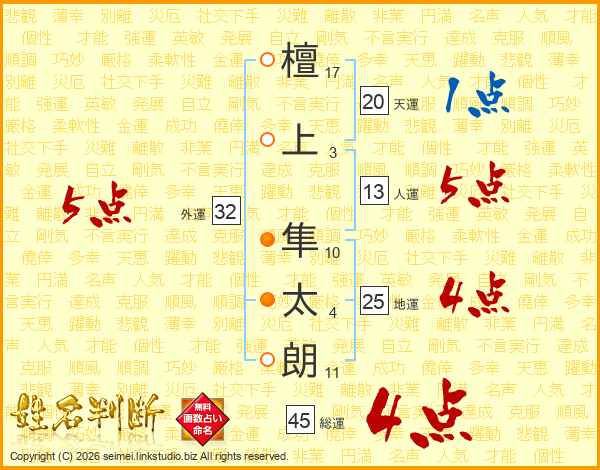 檀(17画)上(3画) 隼(10画)太(4画)朗(11画)