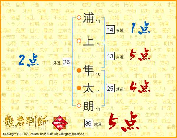 浦(11画)上(3画) 隼(10画)太(4画)朗(11画)