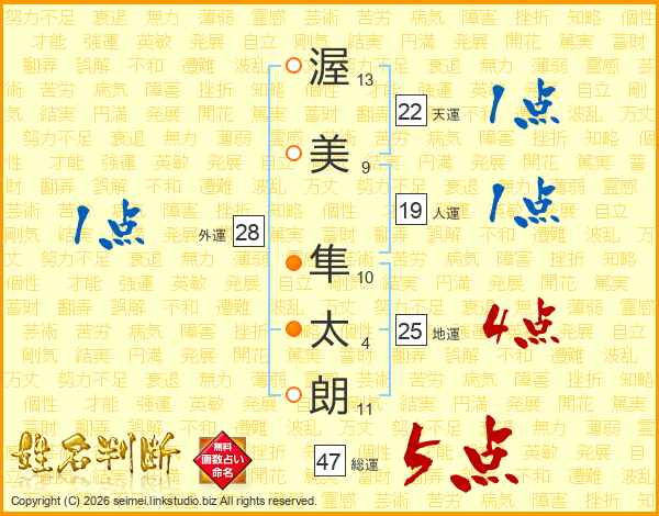 渥(13画)美(9画) 隼(10画)太(4画)朗(11画)