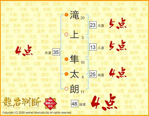 滝(20画)上(3画) 隼(10画)太(4画)朗(11画)