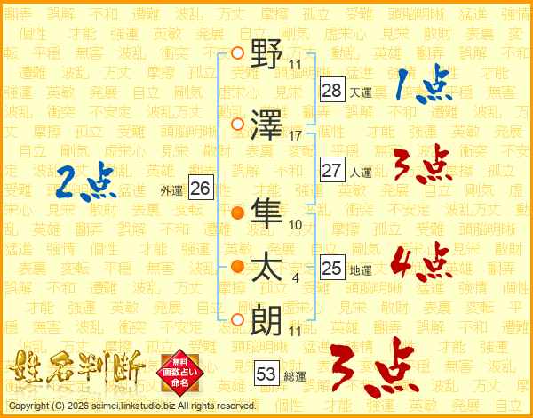野(11画)澤(17画) 隼(10画)太(4画)朗(11画)