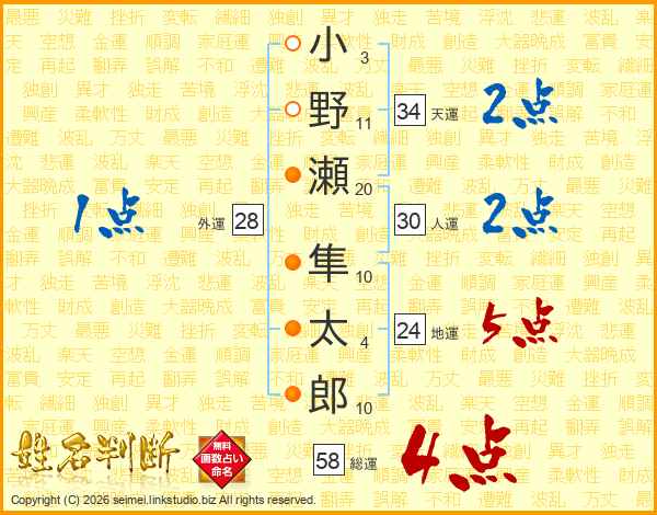 小野瀬隼太郎さんの総運は58画の4点!
