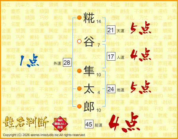 糀(14画)谷(7画) 隼(10画)太(4画)郎(10画)