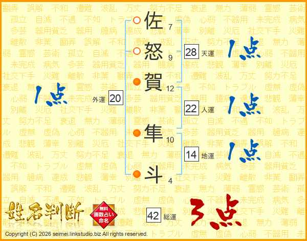 佐(7画)怒(9画)賀(12画) 隼(10画)斗(4画)