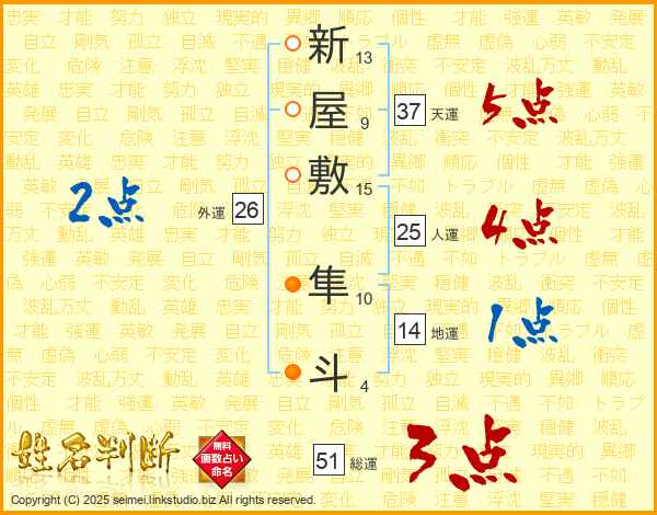 新(13画)屋(9画)敷(15画) 隼(10画)斗(4画)
