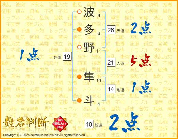 波(9画)多(6画)野(11画) 隼(10画)斗(4画)