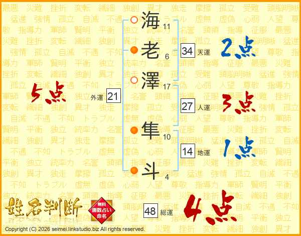 海(11画)老(6画)澤(17画) 隼(10画)斗(4画)