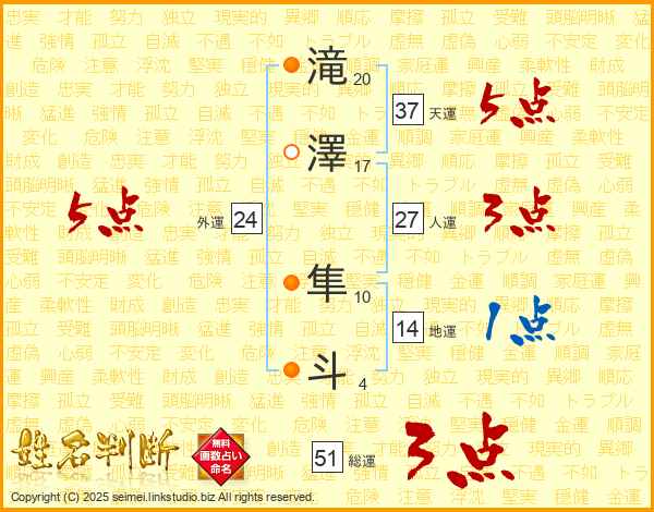 滝(20画)澤(17画) 隼(10画)斗(4画)