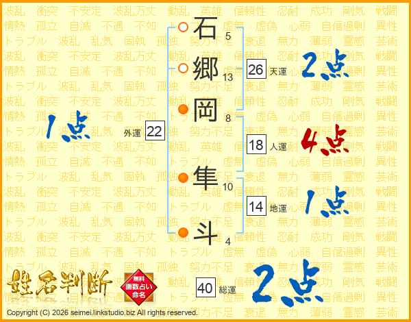 石(5画)郷(13画)岡(8画) 隼(10画)斗(4画)
