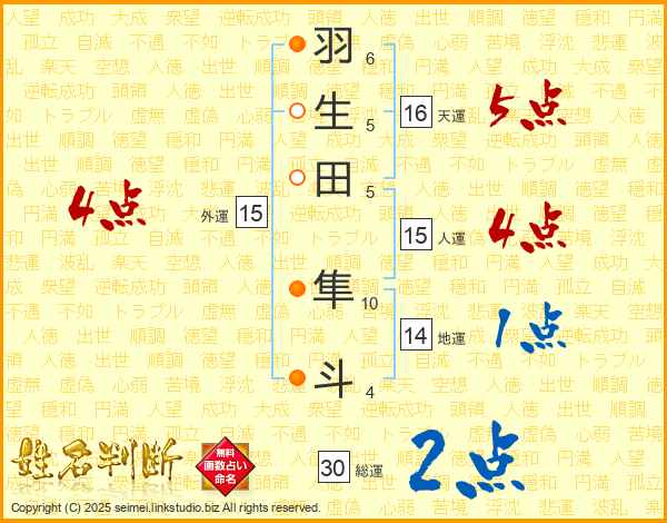 羽(6画)生(5画)田(5画) 隼(10画)斗(4画)