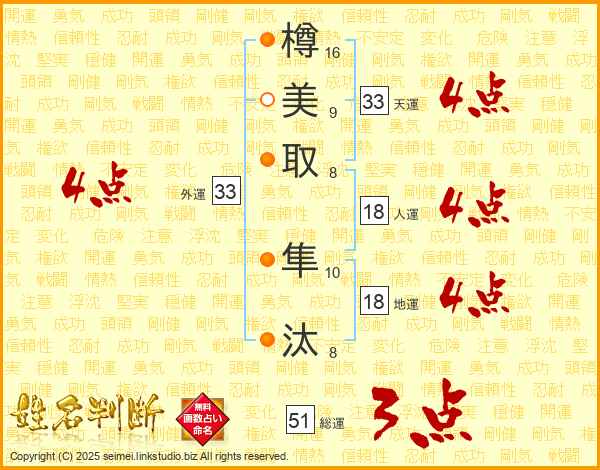 樽(16画)美(9画)取(8画) 隼(10画)汰(8画)