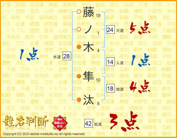藤(19画)ノ(1画)木(4画) 隼(10画)汰(8画)