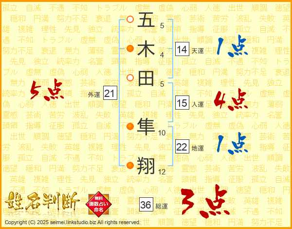 五(5画)木(4画)田(5画) 隼(10画)翔(12画)