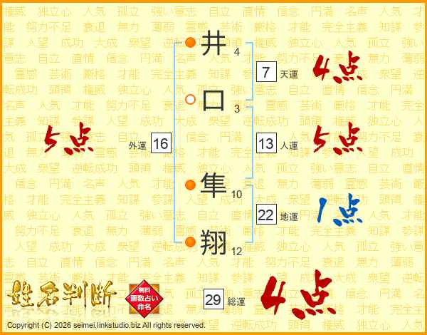 あなたの人生を表す1番重要な運勢です。生涯を通じて影響する総合運となり、主に50歳以降の晩年期に影響を及ぼします。苗字と名前の合計画数。