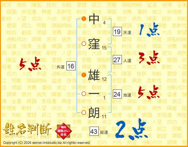 中(4画)窪(15画) 雄(12画)一(1画)朗(11画)