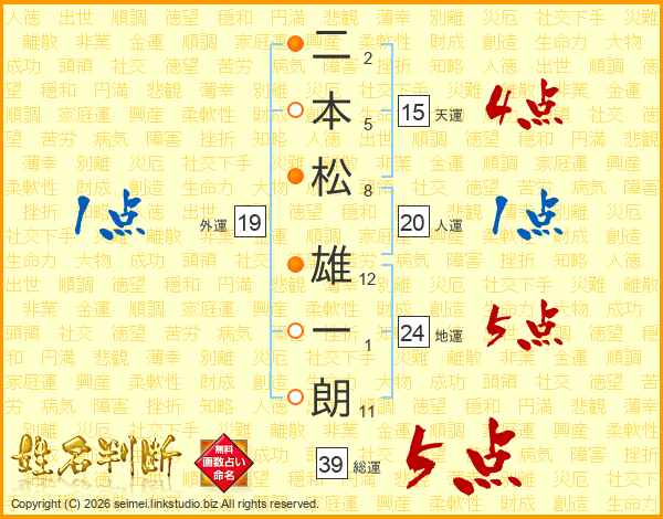 二(2画)本(5画)松(8画) 雄(12画)一(1画)朗(11画)