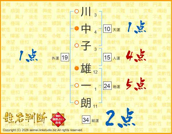 川(3画)中(4画)子(3画) 雄(12画)一(1画)朗(11画)