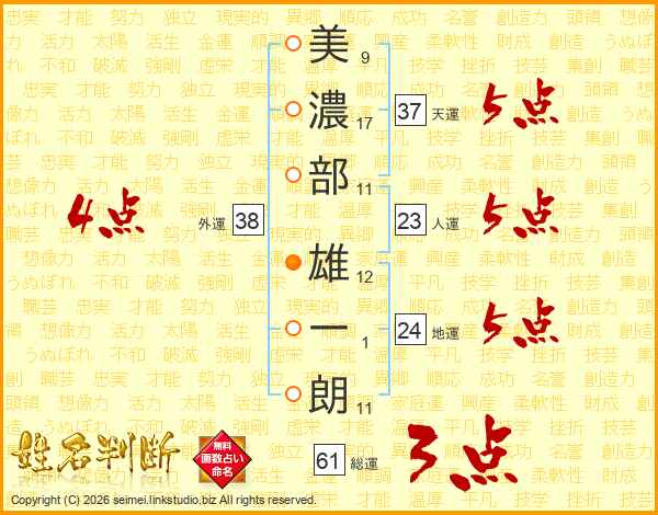美(9画)濃(17画)部(11画) 雄(12画)一(1画)朗(11画)