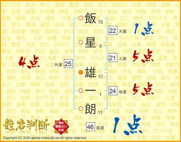 飯(13画)星(9画) 雄(12画)一(1画)朗(11画)