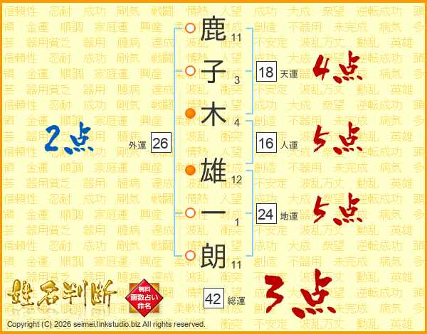 鹿(11画)子(3画)木(4画) 雄(12画)一(1画)朗(11画)