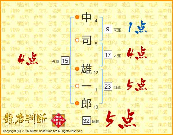 中(4画)司(5画) 雄(12画)一(1画)郎(10画)