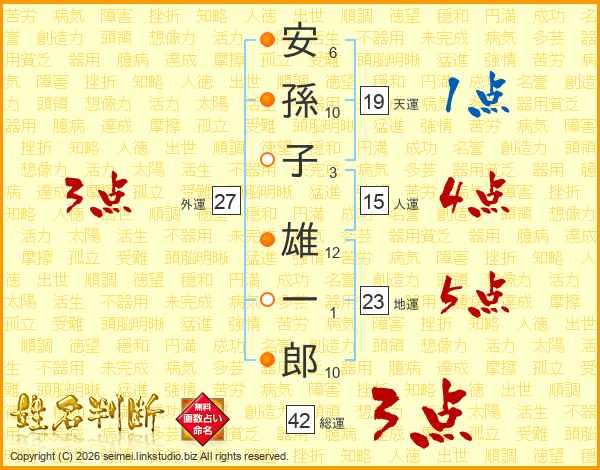 安(6画)孫(10画)子(3画) 雄(12画)一(1画)郎(10画)