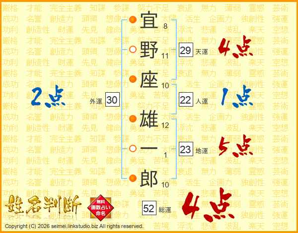 宜(8画)野(11画)座(10画) 雄(12画)一(1画)郎(10画)