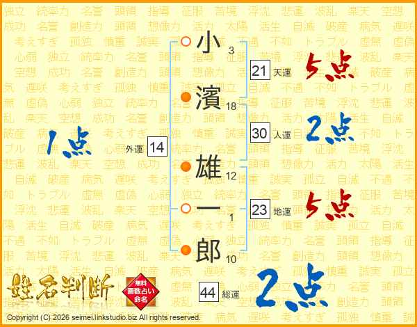 小(3画)濱(18画) 雄(12画)一(1画)郎(10画)