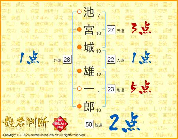 池(7画)宮(10画)城(10画) 雄(12画)一(1画)郎(10画)