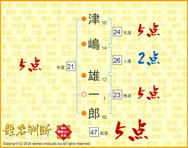 津嶋雄一郎さんの総運は47画の5点!