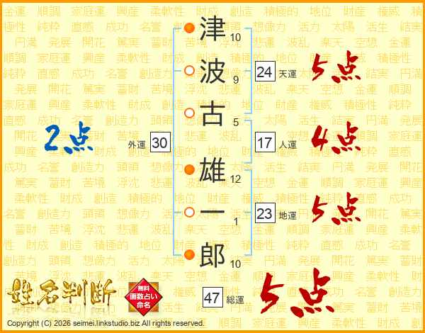 津(10画)波(9画)古(5画) 雄(12画)一(1画)郎(10画)