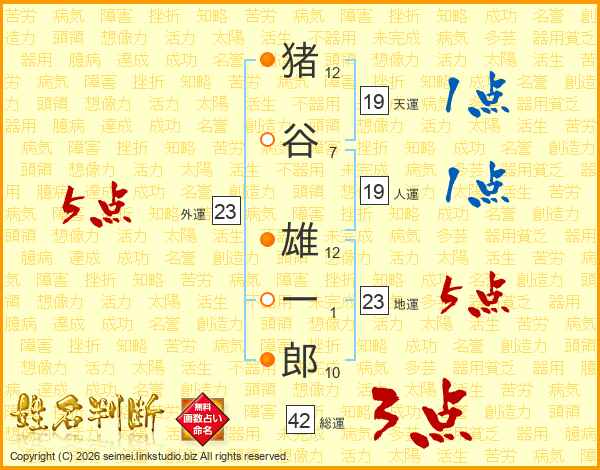 猪(12画)谷(7画) 雄(12画)一(1画)郎(10画)