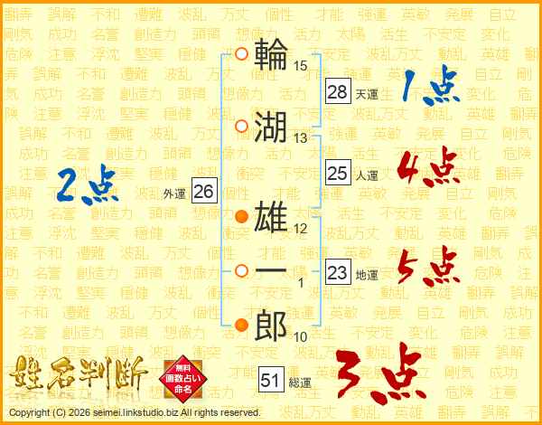 輪(15画)湖(13画) 雄(12画)一(1画)郎(10画)