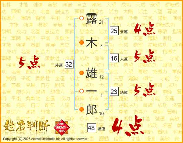 露(21画)木(4画) 雄(12画)一(1画)郎(10画)