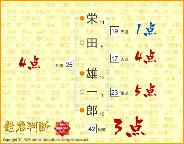 栄(14画)田(5画) 雄(12画)一(1画)郎(10画)