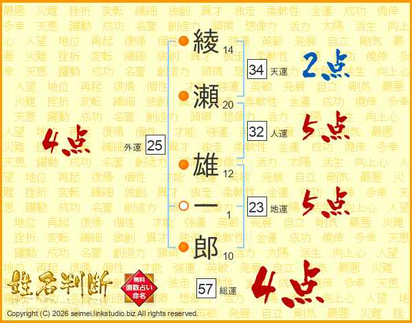 綾(14画)瀬(20画) 雄(12画)一(1画)郎(10画)