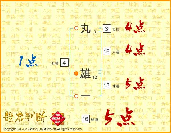 あなたの人生を表す1番重要な運勢です。生涯を通じて影響する総合運となり、主に50歳以降の晩年期に影響を及ぼします。苗字と名前の合計画数。
