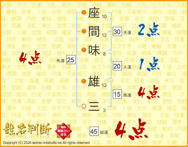 座(10画)間(12画)味(8画) 雄(12画)三(3画)