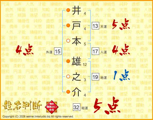 井(4画)戸(4画)本(5画) 雄(12画)之(3画)介(4画)