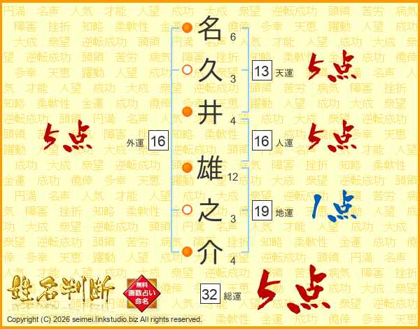 名(6画)久(3画)井(4画) 雄(12画)之(3画)介(4画)