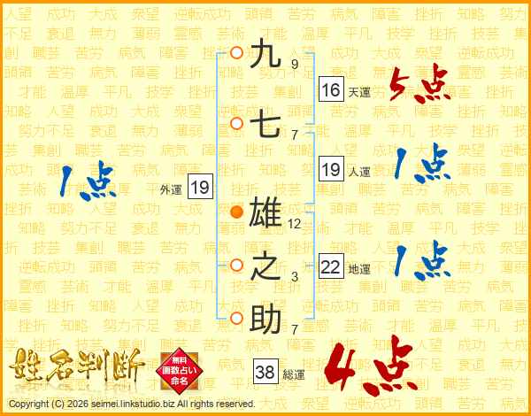 九(9画)七(7画) 雄(12画)之(3画)助(7画)