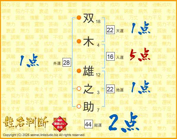 双(18画)木(4画) 雄(12画)之(3画)助(7画)